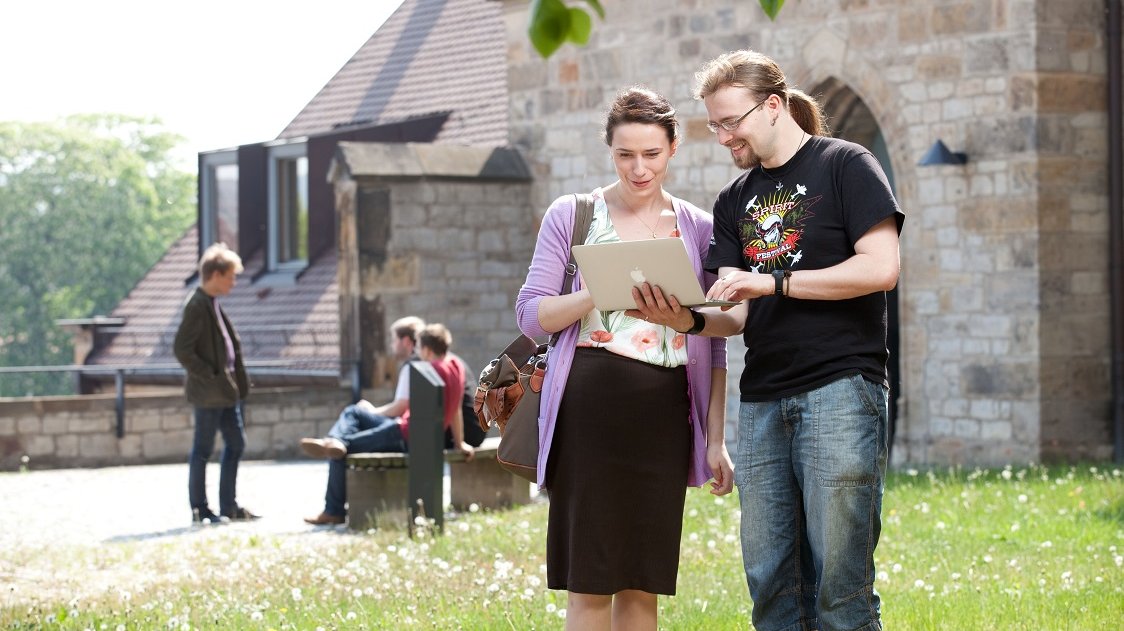 Studierende mit Laptop stehen auf den Kavaten des Erfurter Doms, Domstraße 10, Katholisch-Theologische Fakultät, Universität Erfurt