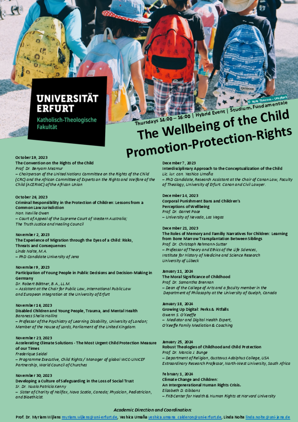 The professorship for canon law cordially invites you to the course "The Wellbeing of the Child: Promotion - Protection - Rights" in the winter semester 2023/2024.