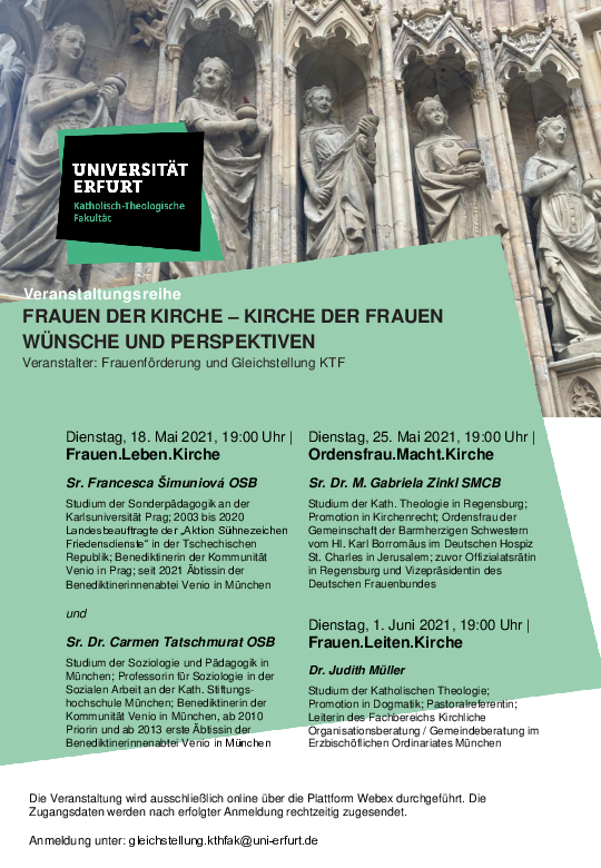 Die Frauenförderung und Gleichstellung an der Katholisch-1heologischen Fakultät hat im Sommersemester 2021 alle Interessierten zu einer Veranstaltungsreihe zum Thema „Frauen der Kirche - Kirche der Frauen. Wünsche und Perspektiven" eingeladen.