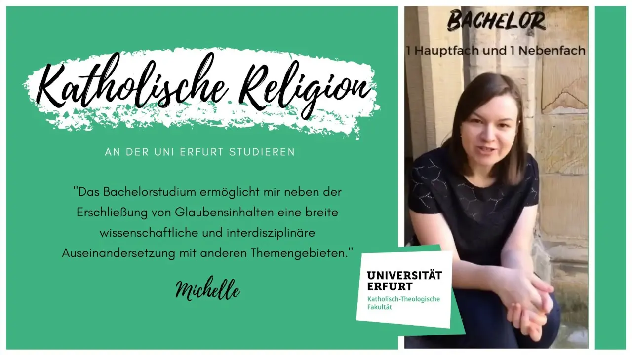 Ich studiere Primare und Elementare Bildung im Hauptfach und katholische Religion im Nebenfach und möchte später als Grundschullehrerin arbeiten. Durch die unmittelbare Nähe der Fakultät zum Erfurter Dom und die übersichtliche Zahl der Studierenden, ist das Studium an der katholischen Fakultät für mich etwas ganz Besonderes.