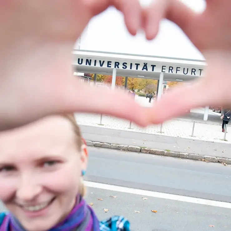Eine Studentin steht am Eingang zur Universität Erfurt