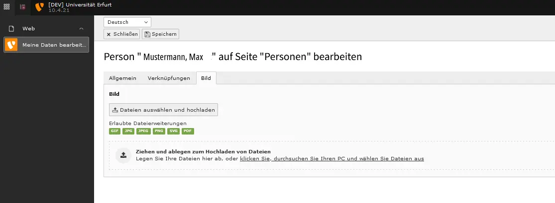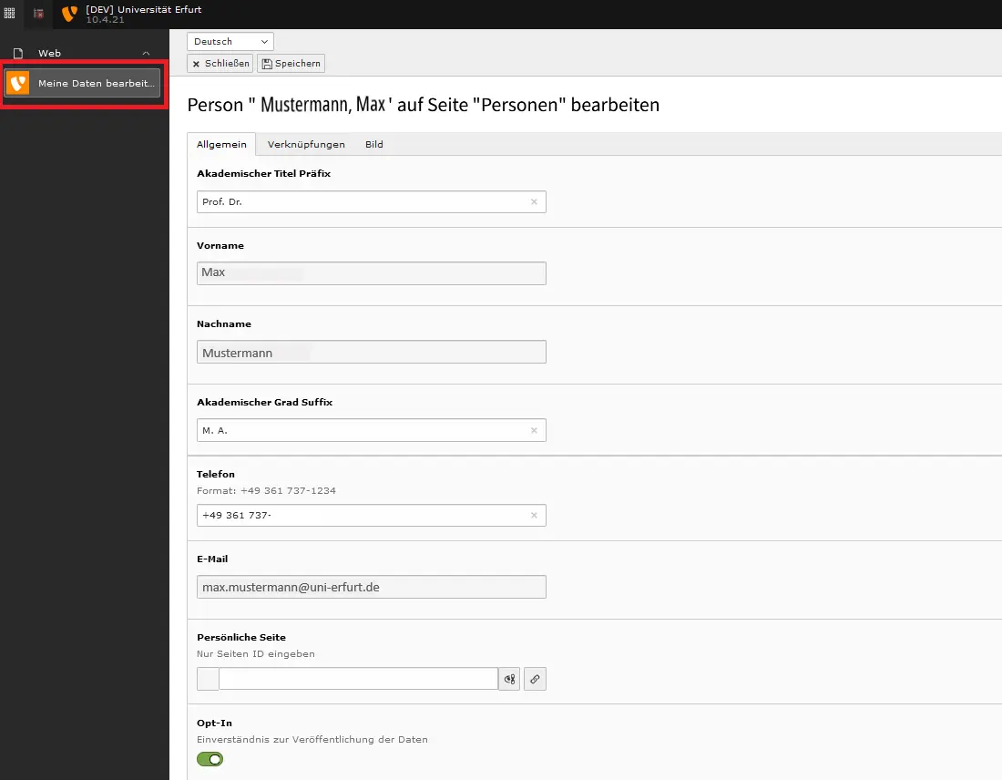 Every person with a university login (LDAP) can log in to edit their personal data record. The data is maintained in the so-called backend, i.e. the area in which all people who have a login with us for editorial maintenance of the website also work on the website. This also means that people who work as editors on the website also see their usual functions for editing pages, while people without these editorial rights only see the "Edit my data" area.