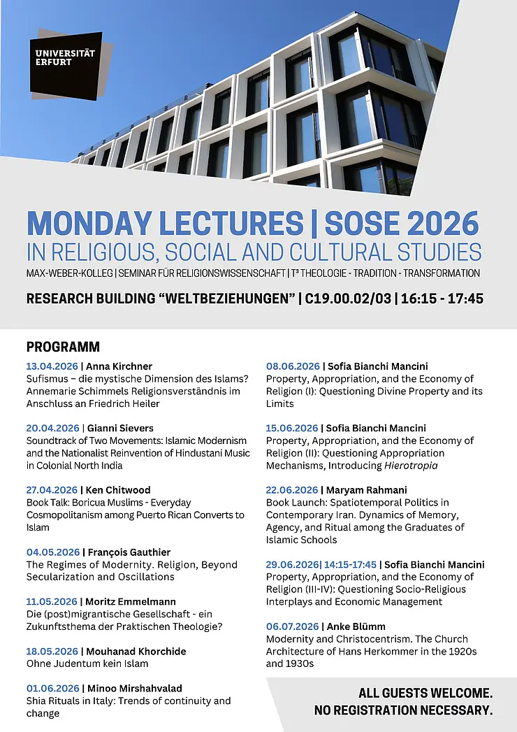 In the current summer semester, the Max-Weber-Kolleg, the Seminar for Religious Studies and the Theological Research Centre t³ Theology - Tradition - Transformation once again invite you to a series of exciting lectures.