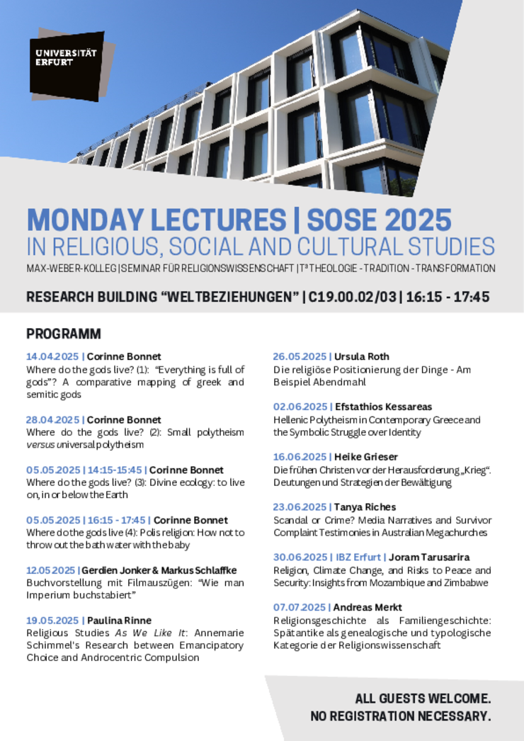 26.05.2025 | Ursula Roth: Die religiöse Positionierung der Dinge - Am Beispiel Abendmahl 02.06.2025 | Efstathios Kessareas: Hellenic Polytheismin Contemporary Greece and the Symbolic Struggle over Identity