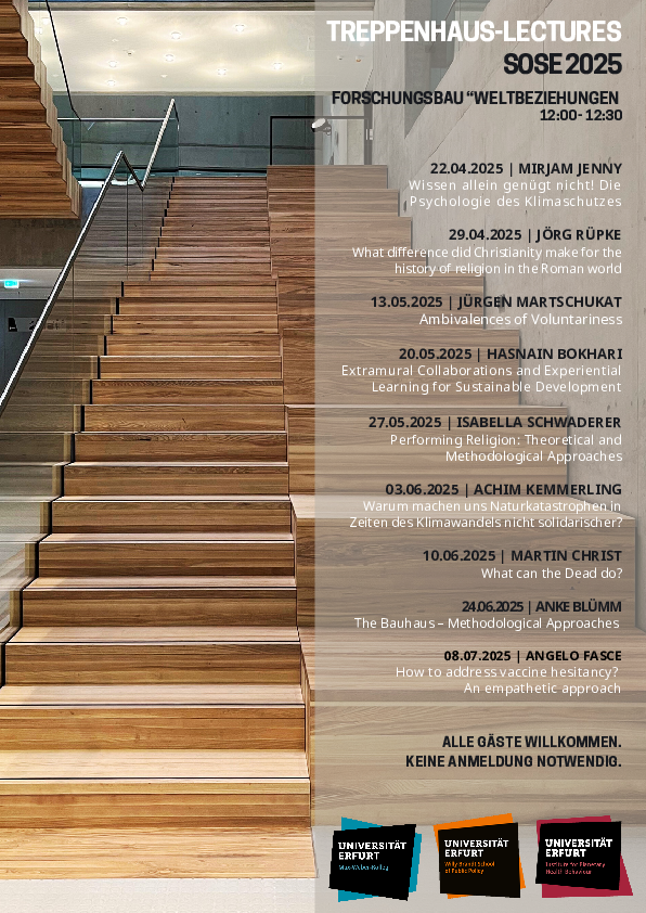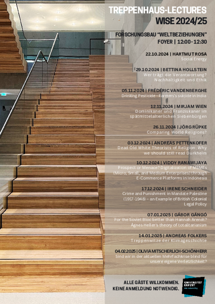 The Max Weber Kolleg at the University of Erfurt is starting the winter semester 2024/25 with a new event format: In the ‘Staircase Lectures' (Treppenhaus-Lectures), academics from the Max Weber Kolleg will offer exciting insights into their research projects in short lectures.