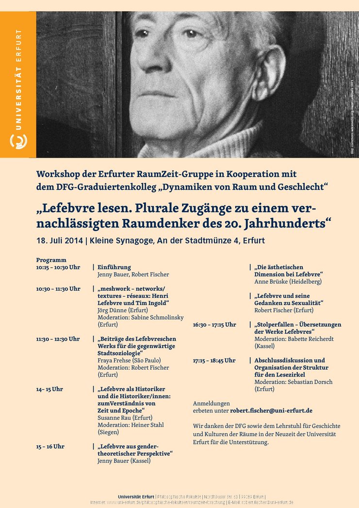The theoretical and methodological analysis of concepts about Spatiality, Temporality and SpatioTemporality has been a central field of research and discussion within the Erfurt SpaceTime Research Group since its foundation. Accordingly, methodological and theoretical reflexions are not only at the center of attention in single contributions but also frame the topic of some of the groups events. Currently we are concerned especially with the oeuvre of Henri Lefebvre.