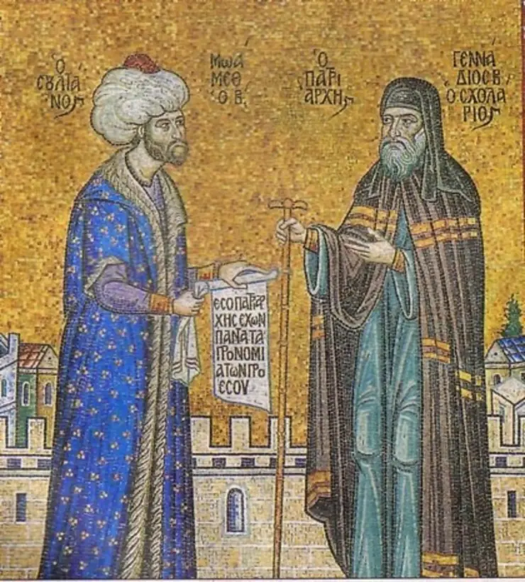 Dieses Mosaik befindet sich im Eingang des historischen Hauptgebäudes des Ökumenischen Patriarchats von Konstantinopel (Istanbul, Türkei). Rechts wird Patriarch Gennadios II., geboren Georgios Scholarios (ca. 1400–ca. 1473), abgebildet, der erste orthodoxe Patriarch nach dem Fall Konstantinopels am 29. Mai 1453 an die Osmanen. Links steht Sultan Mehmed II. der Eroberer (1432–1481) mit einer Schriftrolle in der Hand, die er dem Patriarchen aushändigt. Auf dieser Schriftrolle ist folgende Inschrift in griechischer Sprache zu lesen ...