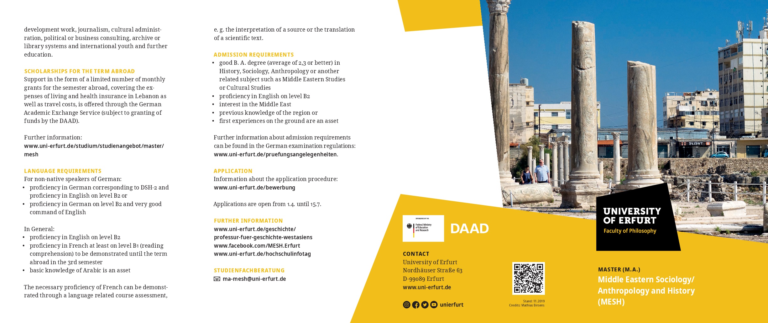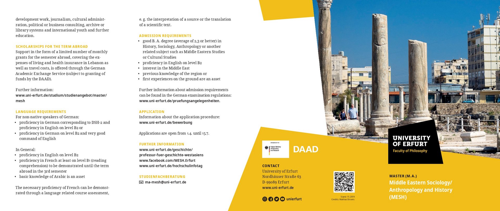 Historical change, cultural diversity and political change in the Middle East are among the central subjects of the binational Master program "Middle Eastern Sociology/ANthropology and History" (MESH). The program is currently carried out by the University of Erfurt, Germany and Universiré Saint-Joseph (Beirut,Lebanon). The joint studies with Lebanese students in Erfurt as well as a mandatory semester abroad in Lebanon are at the heart of the program to expand the students' perspective and enable them to get a complete understanding of the region. The Semester abroad is supported with scholarships by the German Academic Exchange Service (DAAD).