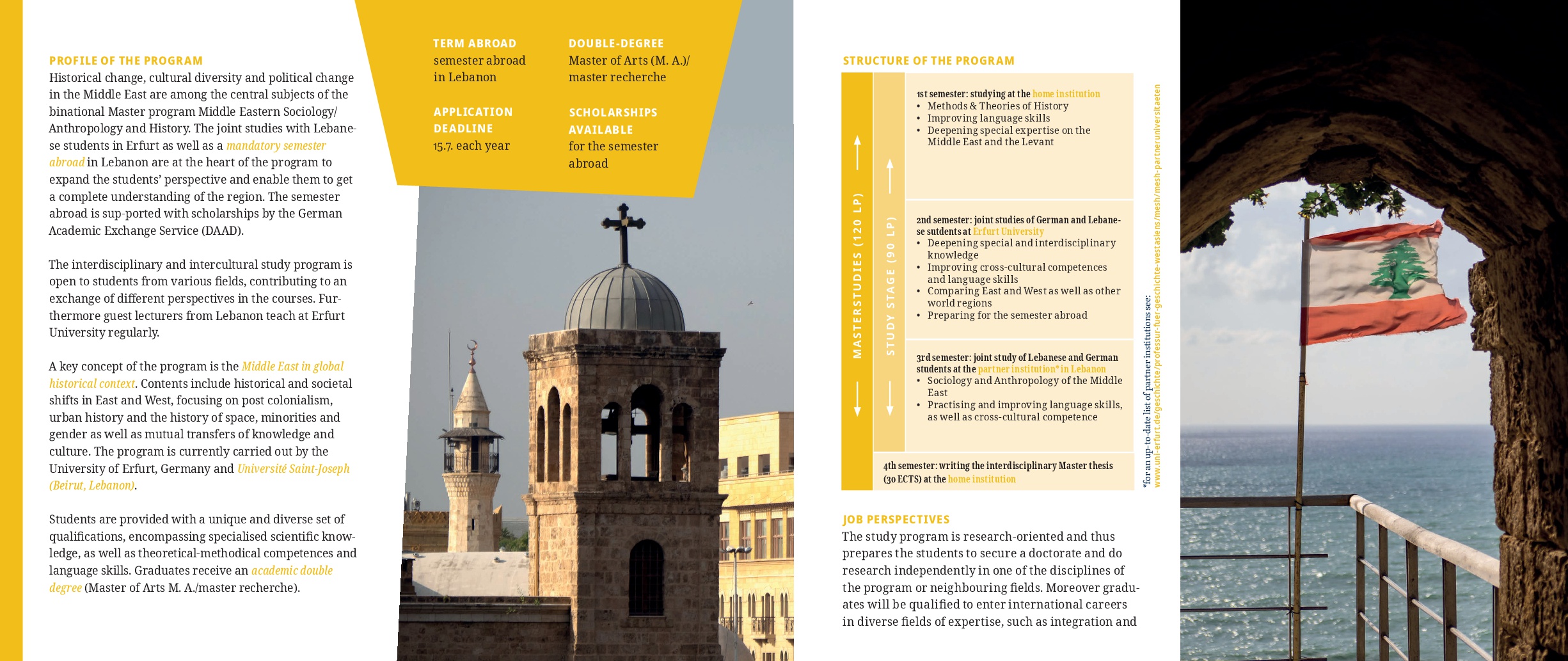 The interdisciplinary and intercultural study program is open to students from various fields, contributing to an exchange of different perspectives in the courses. Furthermore, guest lecturers from Lebanon teach at Erfurt University regularly. Students are provided with a unique and diverse set of qualifications, encompassing specialised scientific knowlwdgw, as well as theoretical-methodical competences and language skills. Graduates receive an academic double degree (Master of Arts M.A./master recherche).