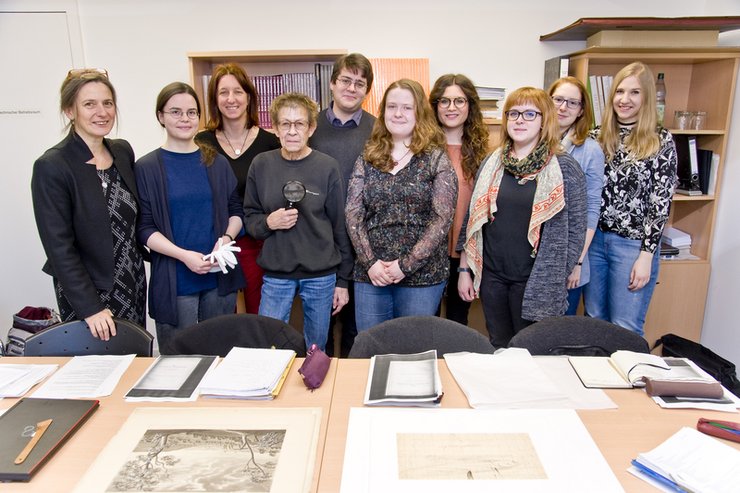 Die wöchentliche intensive Beschäftigung mit dem Dornheim-Konvolut ermöglichte den SWK-Studierenden Viola Baser, Daniel Baumbach, Sarah Kühnel, Mandy Nette, Judith Thomann, Johanna Weißler und Alina Zeller Erfahrungen beim praktischen und theoretischen Umgang mit dem Werkbestand. Neben dem konservatorisch sachgerechten Umgang mit den Bleistift-, Feder- und Pinselzeichnungen thematisierte das Seminar vor allem Zuschreibungsfragen. Daher bildete das vergleichende, kritische Sehen den gewichtigen Schwerpunkt der Zusammenkünfte, flankiert von Fragen zur Provenienz, zur Bildanalyse und Motivkunde, die intensiv diskutiert wurden. Zeichentechnologie und Materialbeschaffenheit standen ebenso im Focus wie Biografie und Zeitkontext. ...mehr lesen