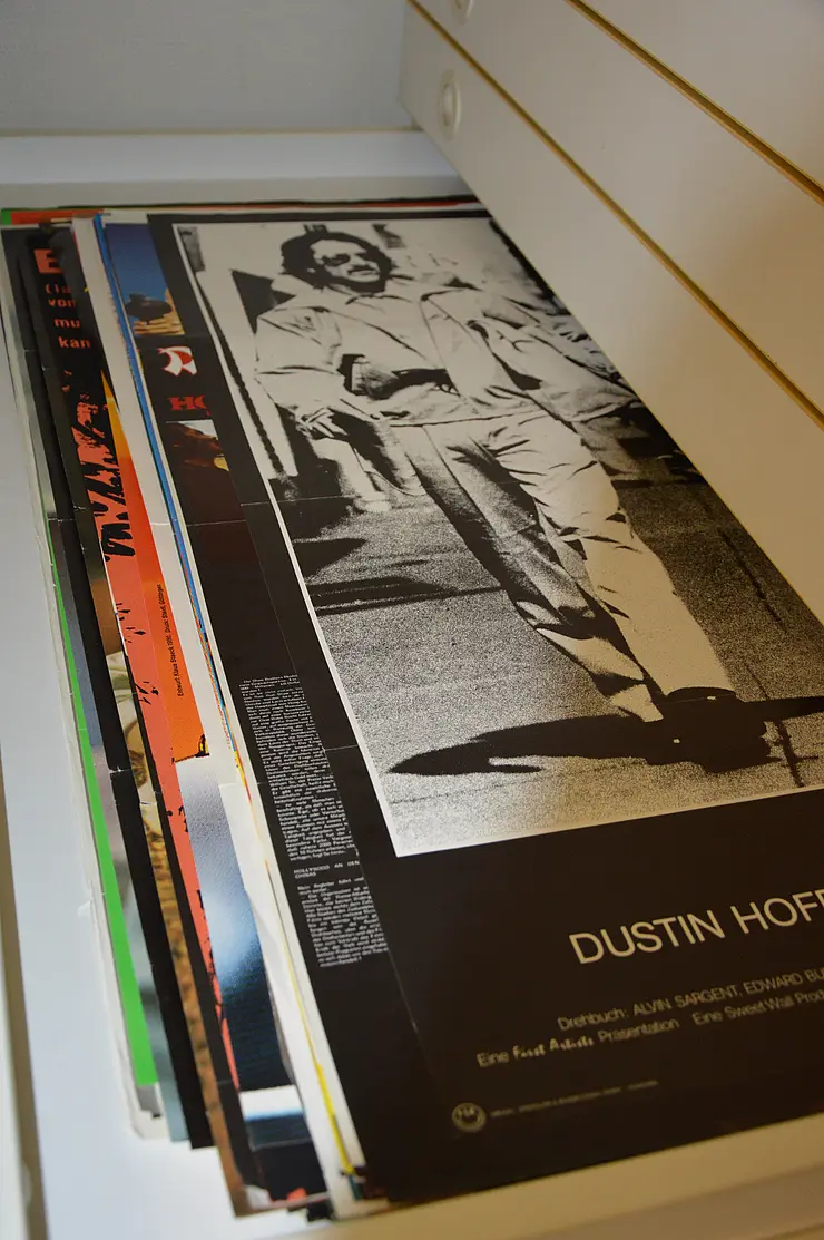 • alle Plakate lagern plano in passenden Grafikschränken mit Schubladen, waren aber fast alle ursprünglich vom Verleih gefaltet abgegeben worden