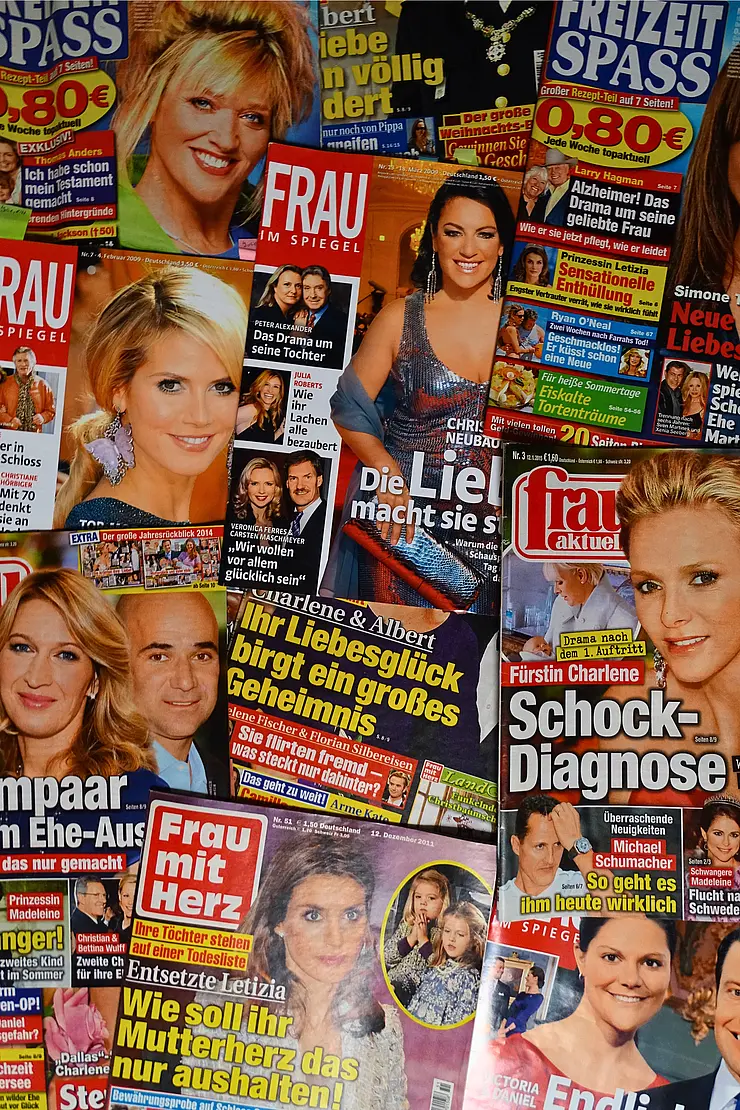 • über 10.000 Einzelhefte aus der deutschen Regenbogenpresse: 20 verschiedene Titel im Zeitraum von 2007 bis 2019; u.a. „Bunte“, „Gala“, „Grazia“, „In Touch“, „Das goldene Blatt“, „7 Tage“, „Freizeit Revue“, „Die Zwei“, „Neue Post“, „Neue Woche“, „Die neue Frau“ etc.