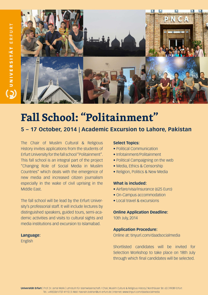 It is with these aspects in mind that the Chair of Muslim Culture and Religious History wishes to offer a joint course for the students of Erfurt and Punjab University in Pakistan to discuss the rising issues in the field of politics, media or Politainment. In this regard, the Chair of Muslim Culture and Religious History at the University of Erfurt is inviting applications for the Fall School on Politainment in Lahore, Pakistan 5-17 October, 2014.