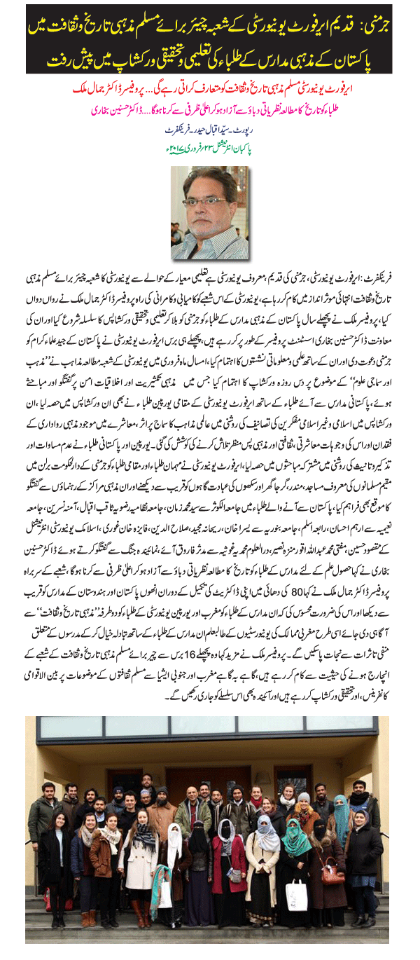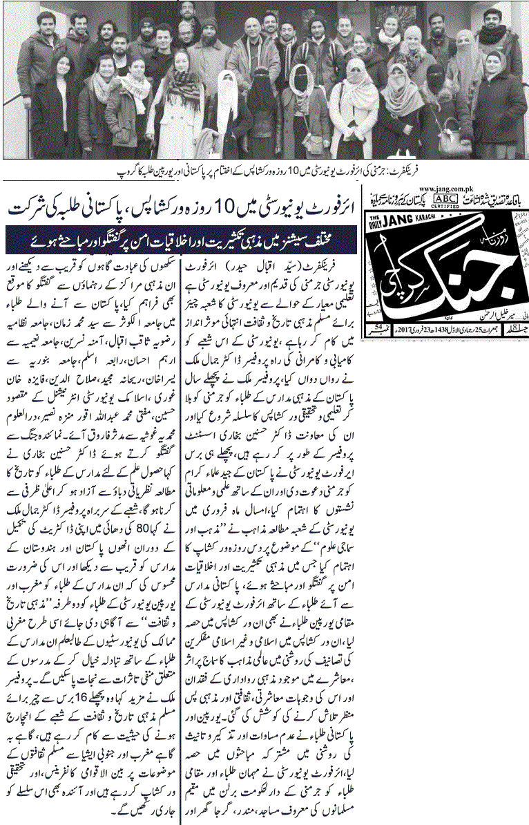 In January 2016, the Chair of Muslim Cultural & Religious History (CMCRH), University of Erfurt initiated a new research-cum-dialogue project titled ‘Religious Pluralism & Religious Plurality: towards an ethics of peace’. This academic endeavor invites male and female students from religious seminaries from Pakistan to participate in workshops at the University of Erfurt.