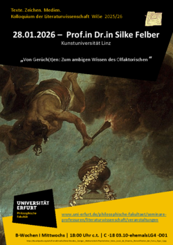 kultureller Identität .; Dr. Jurij Lileev (Universität Freiburg) 17.12.2025: Kulturtechniken des Ent-Sammelns ; Prof. Dr. Wolfgang Struck und Dr. Jana Mangold (Universität Erfurt) 14.01.2026: t.b.a., PD Dr. Kai [...] Kai van Eikels (Ruhr Universität Bochum) 28.01.2026: Von Gerüch(t)en: Zum ambigen Wissen des Olfaktorischen ; Prof.in Dr.in Silke Felber (Kunstuniversität Linz) Participation is possible without registration...