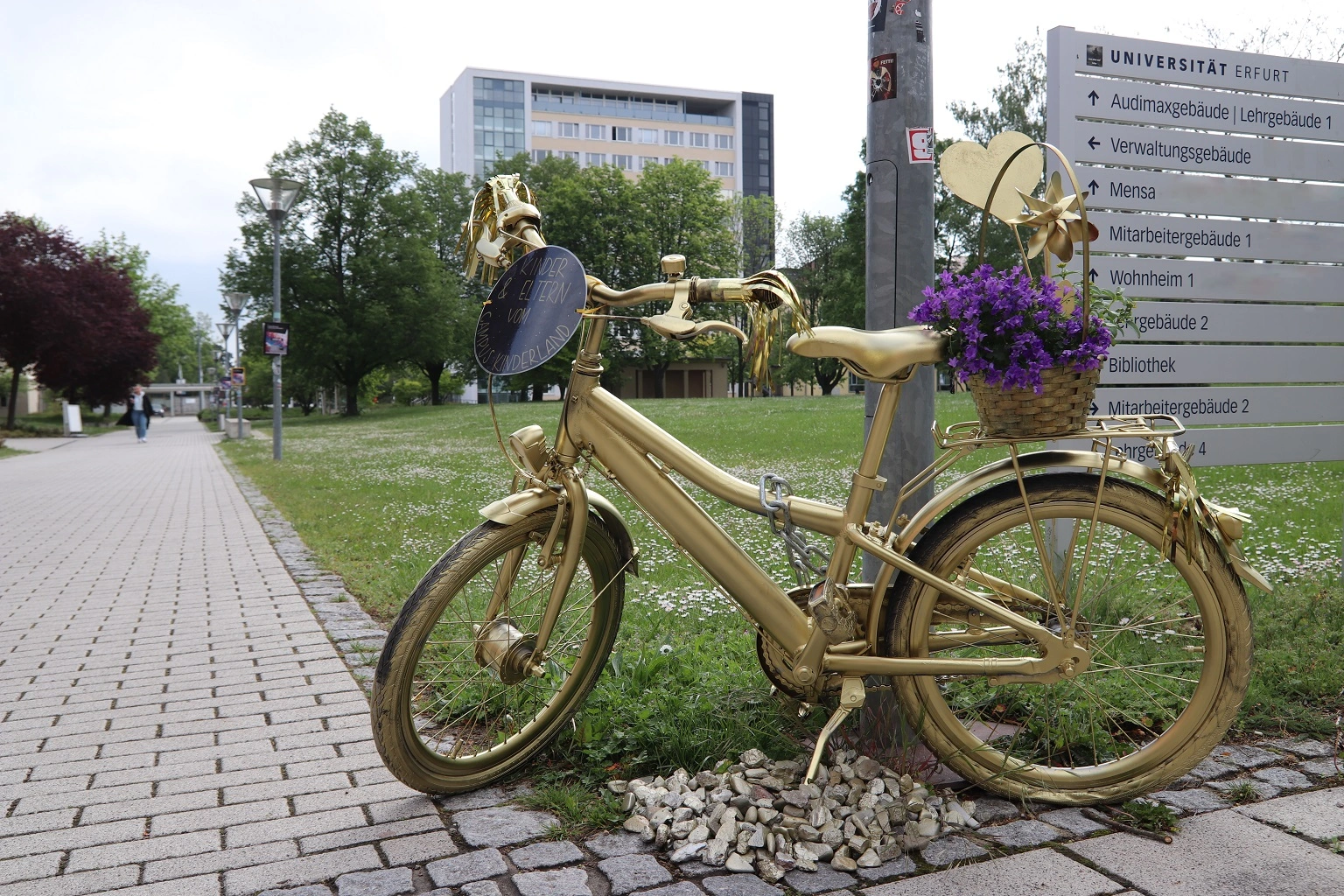 As a visible sign, children and parents from the daycare centre will place a decorated golden bicycle in front of the administration building on this day. The students want to decorate various places on campus with gold foil. In addition, three thematically appropriate lectures are planned in lecture theatre 2 (KIZ): Dr Bodie Ashton will speak at 4 pm on "Liberation and Historical Responsibility. Remembering, Unremembering, and Forgetting on 8 May" (in English). Professor Sabine Schmolinsky will give her lecture at 5 pm on "Historical Contects of Right-Wing Extremist Ideas" (in German). And Dr Zeynep Gülsah Çapan will speak at 6 pm on "Eurocentrism in International Relations" (in English). Each lecture will be followed by an opportunity for discussion and questions.