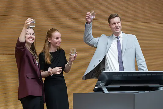 Den Höhepunkt der Graduierungsfeier bildete die feierliche Zeugnisübergabe, die mit einem anschließenden Sektempfang ihren Ausklang fand. Dabei kamen Absolvent:innen, Familien, Freund:innen und Professor:innen in entspannter Atmosphäre zusammen. Bei anregenden Gesprächen bot sich die Gelegenheit, Erlebnisse Revue passieren zu lassen und gemeinsam auf die erreichten Erfolge anzustoßen.