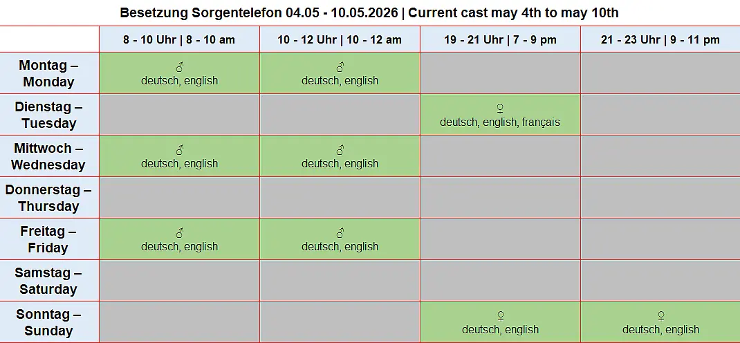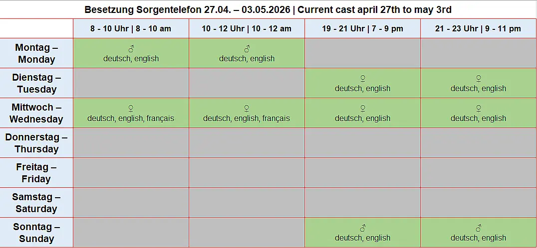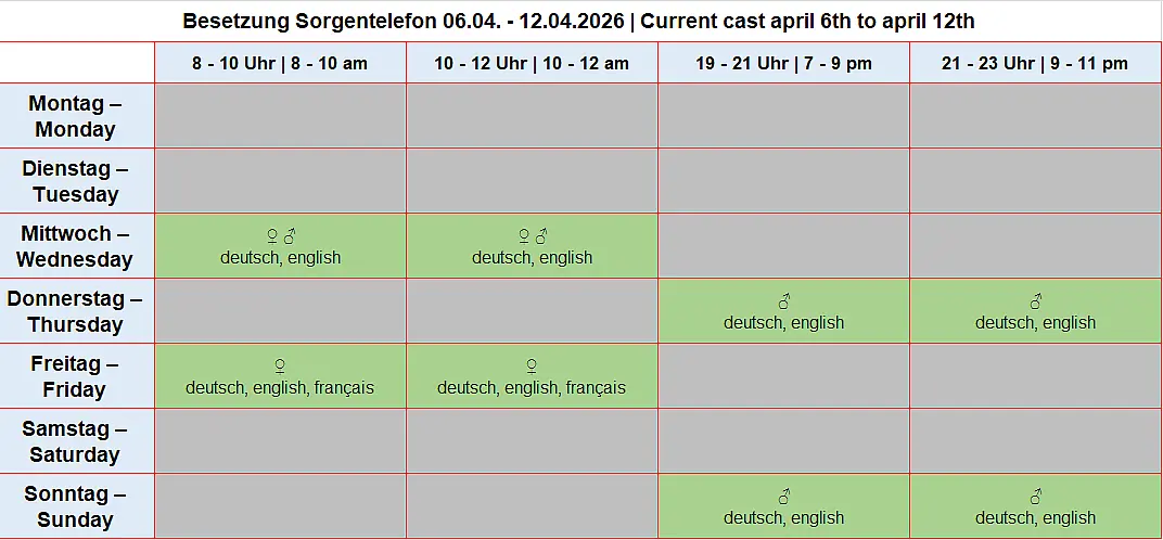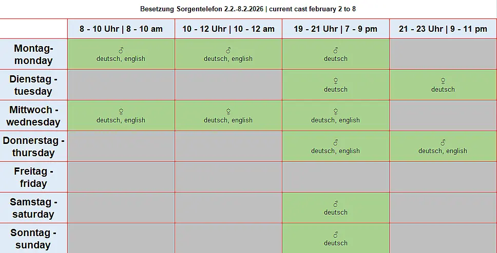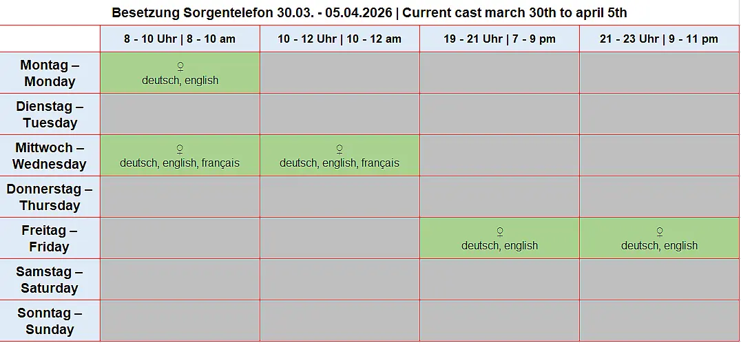 The helpline has two lines but no mailbox. If you call outside of office hours or if both lines are busy, please simply call again later. Thank you very much!