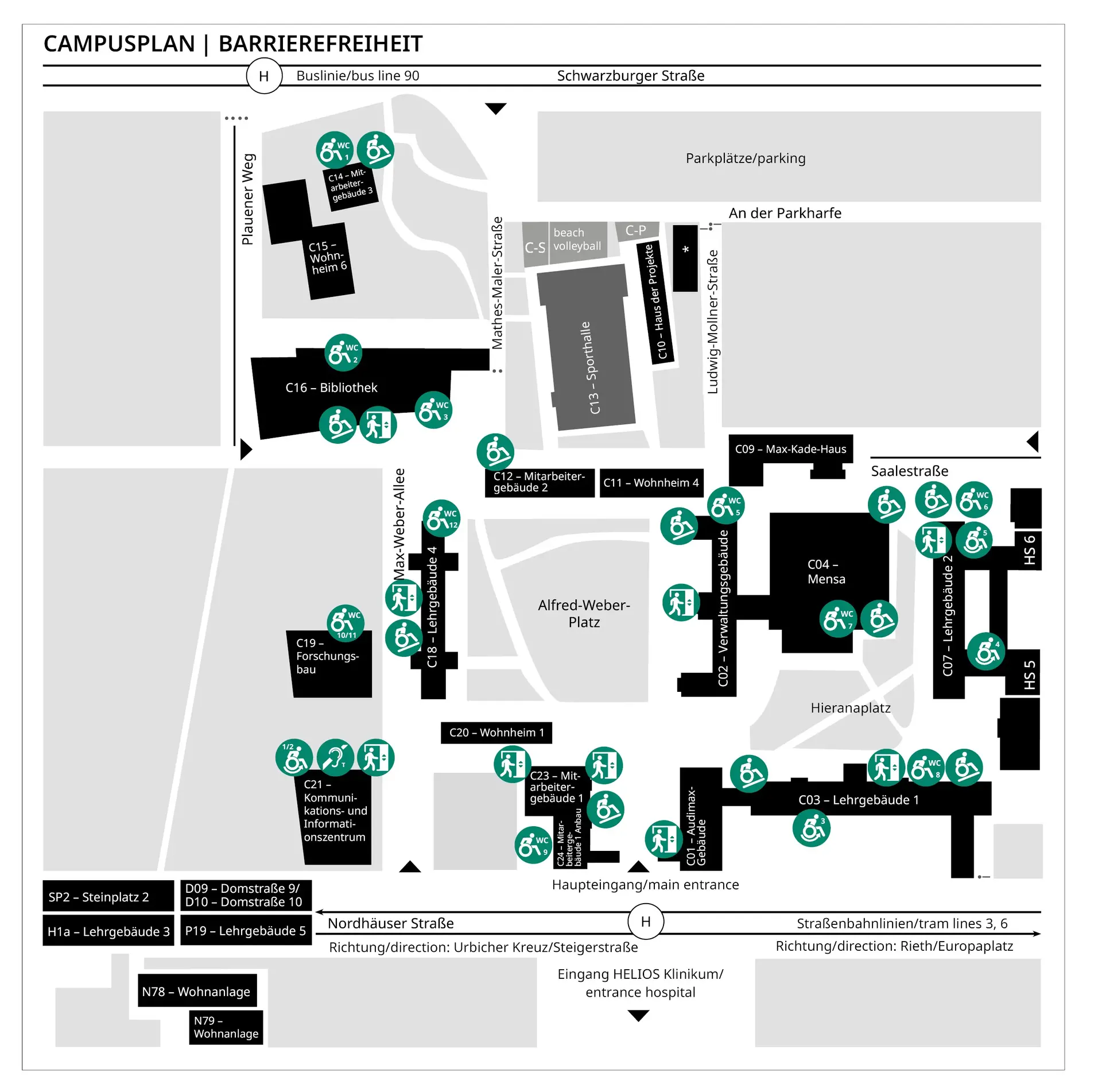 In principle, all teaching buildings are accessible for wheelchair users. For courses, we try to make the courses on the ground floor accessible to you. You should send us your timetable in good time so that we can take it into account when allocating rooms in Dezernat 1.