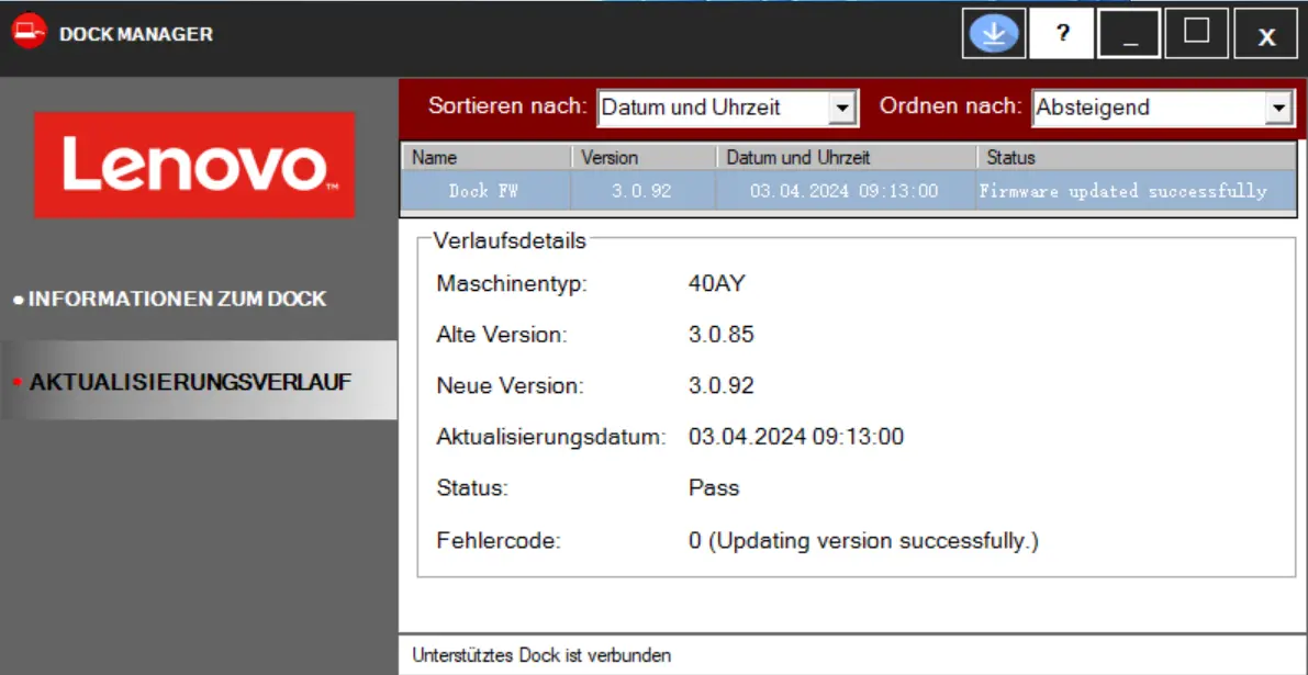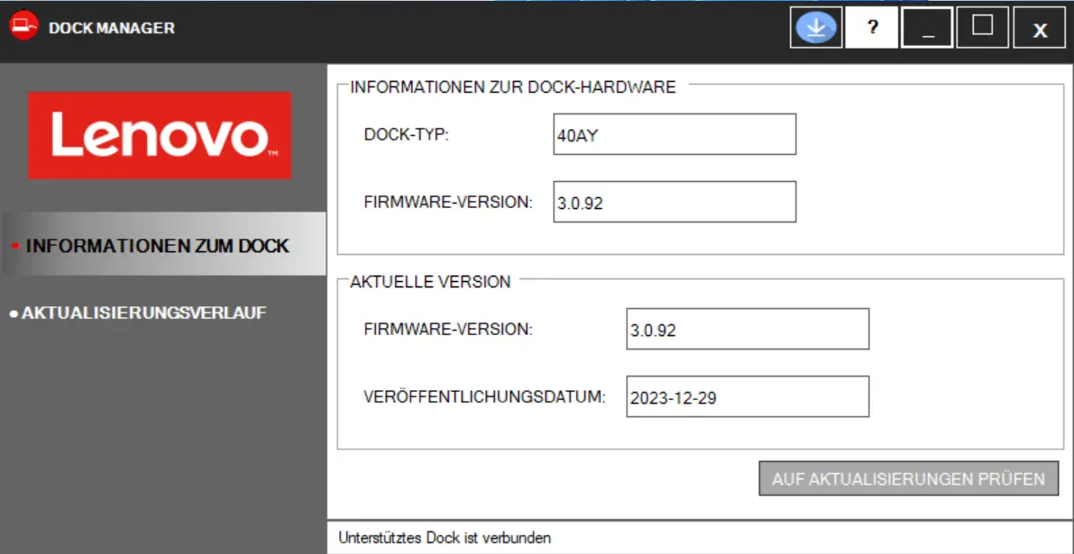 You can also check for updates and update the firmware yourself at any time using the Lenovo Dock Manager ( Figure 1). The software also provides an overview of the update history ( Figure 2).