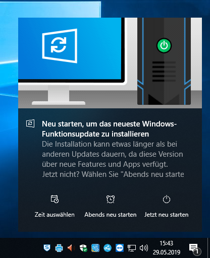 Update procedure: The function update will be downloaded in the background and then installed as far as possible. Afterwards, a message window (see illustration or similar) is displayed that a restart is necessary for a Windows function update - with various selection options if it is inconvenient. The hint that the restart may take a little longer is to be taken seriously, but this depends strongly on the age of the respective computer. Rarely, the update fails at the first attempt before the restart prompt. However, this should not worry you. Most of the time, the second pass is successful. If persistent installation problems occur or something does not work after the update, please contact the URMZ.