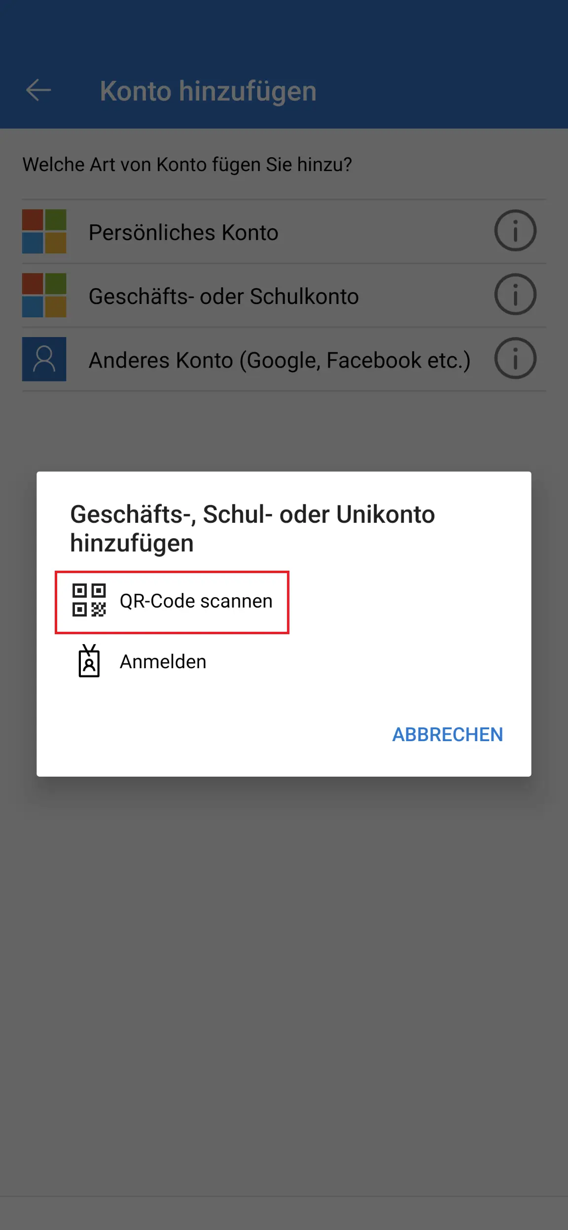- In the next step, select "Business or school account" (image 5) and select "Scan QR code" (image 6).