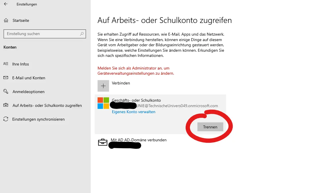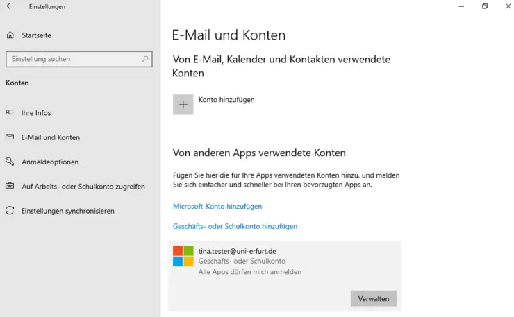 As soon as an M365 user signs in to a device synchronized to Azure Active Directory, the user account appears as a work or school account in Windows Settings under "Accounts" -> "Email and Accounts".