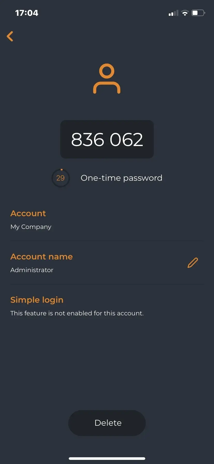 - Select your account in the app and the current One-time password (OTP) will be displayed. This password changes every 30 seconds (Figure 9 - Manufacturer's example account).