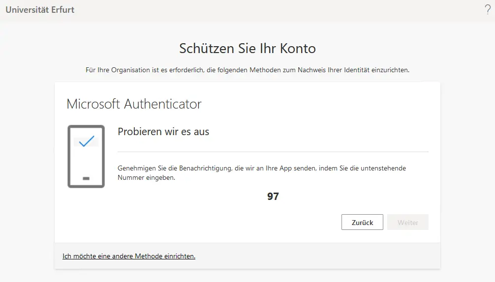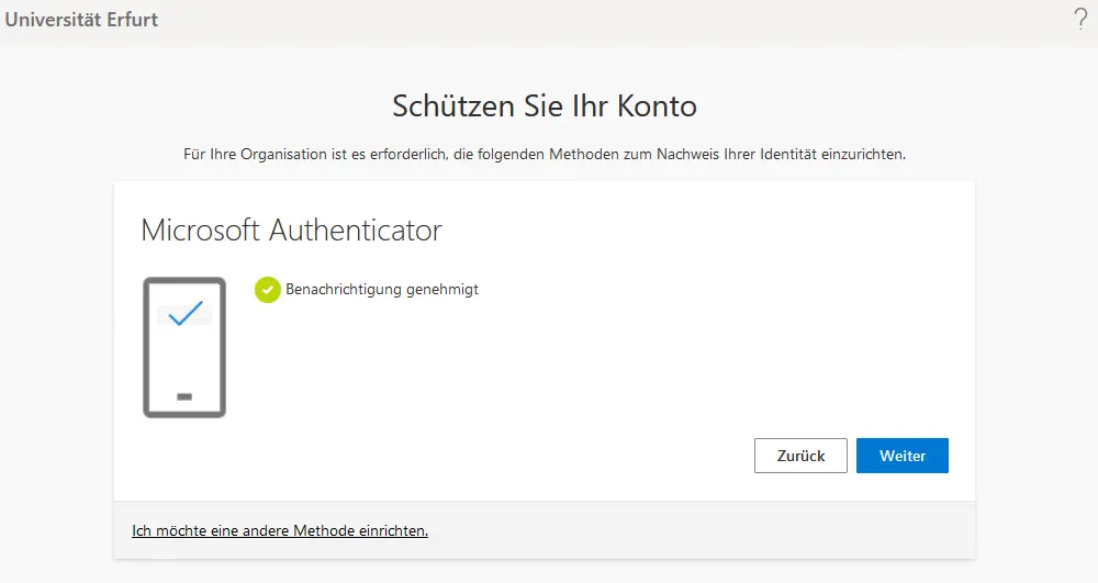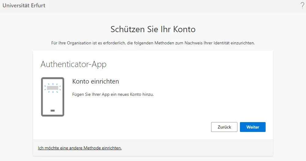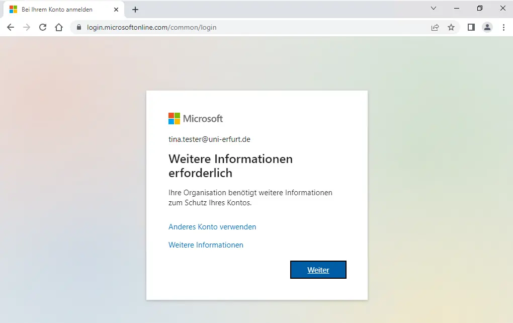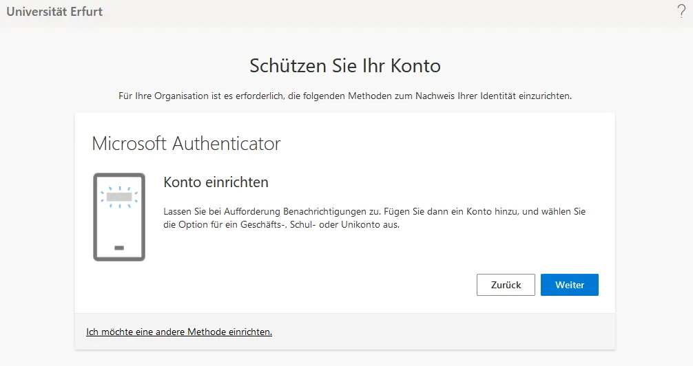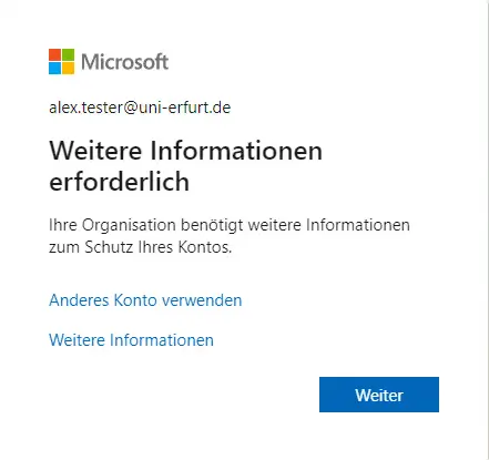 For security reasons, it is always necessary to set up multi-factor authentication (MFA) for every M365 account. The only exception is for service devices that are synced to Azure AD (all devices centrally managed by the URMZ) and when using Microsoft Edge, Mozilla Firefox or Google Chrome browsers on these devices. On all other devices and when using other browsers, the setup is mandatory (prompt see picture on the right).