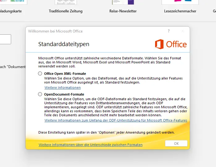 Subsequently, the license agreement must be accepted (Figure 5) and the desired standard file types (Office Open XML formats or OpenDocument formats) must be selected (Figure 6). Finally, a restart of the just opened Microsof 365 Apps is necessary (Figure 7).