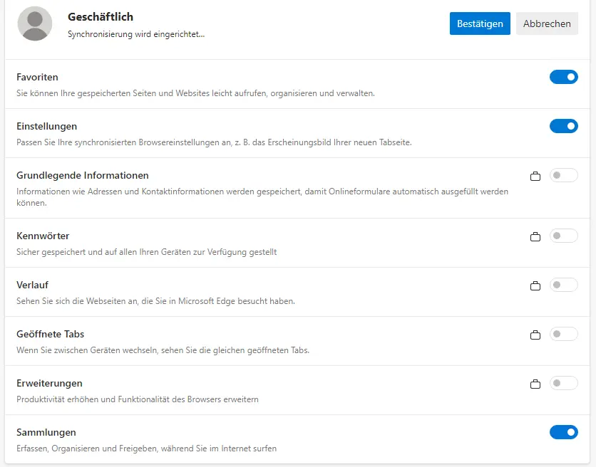 When Edge is started for the first time with a work account active in Windows, the desired synchronization settings are queried (Figure 1).
