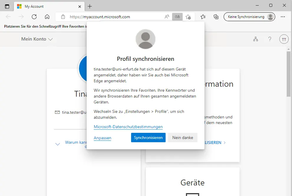 Here, by clicking on "Synchronize", the user has the possibility to synchronize the preset areas (favorites, settings and collections) with M365, so that they are available on any device where a login is made with the same account. By clicking on "Customize" the areas to be synchronized can be adjusted and by clicking on "No thanks" the synchronization can be completely denied.