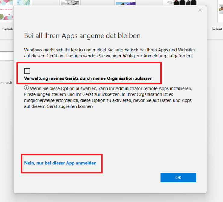 The first time you start one of the installed M365 Apps for Enterprise, you need to log in with your M365 account for Office activation (Figure 1, 2 and 3). In the following dialog (Figure 4), uncheck the box "Allow my organization to manage my device" and click "No, only log in to this app". Important: Do NOT click on "OK." This would create their M365 account on Windows as a business account and register their device in the Microsoft 365 directory service (Azure Active Directory) at the University of Erfurt and store data from the device at Microsoft - possibly in third countries.