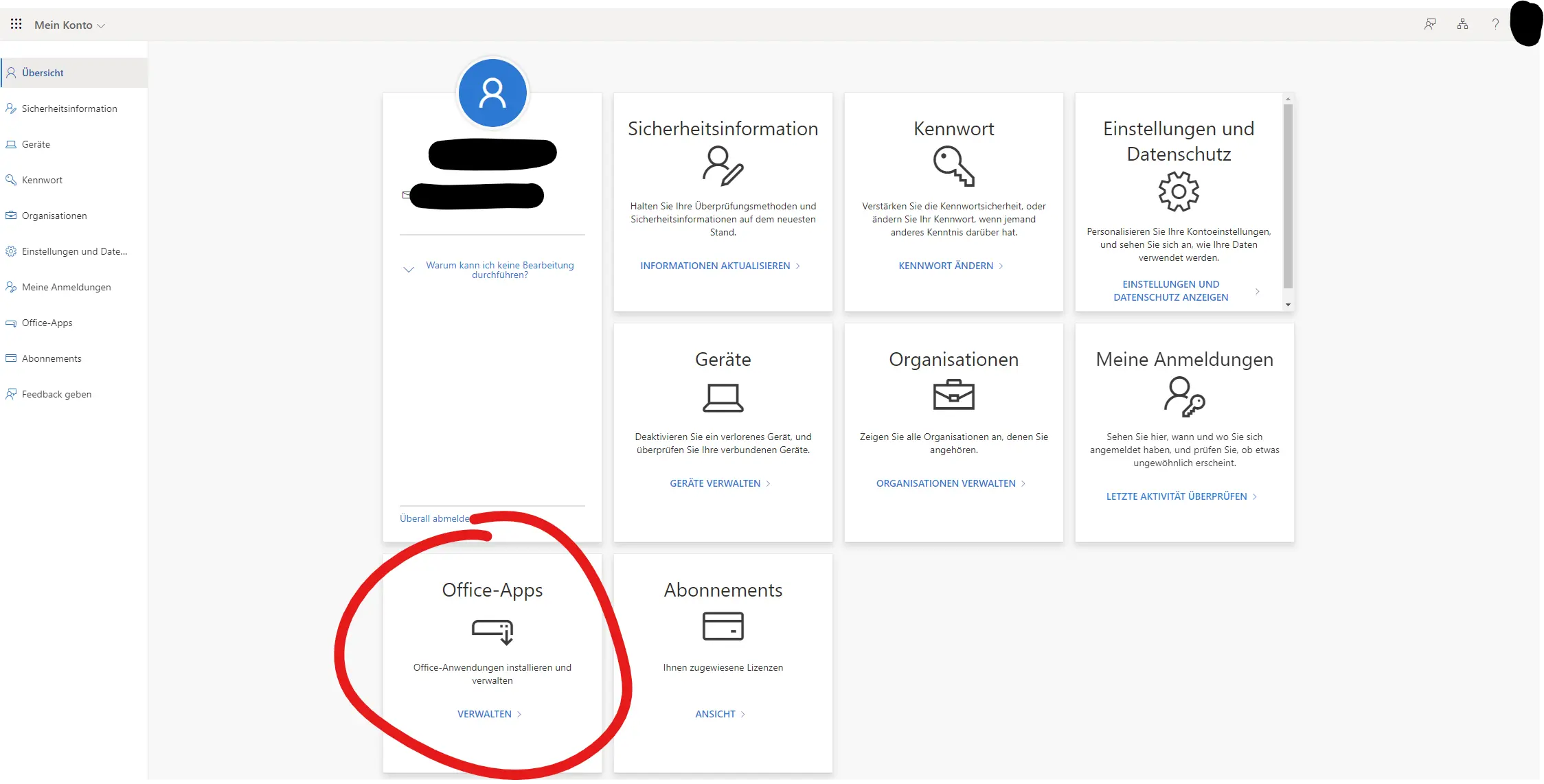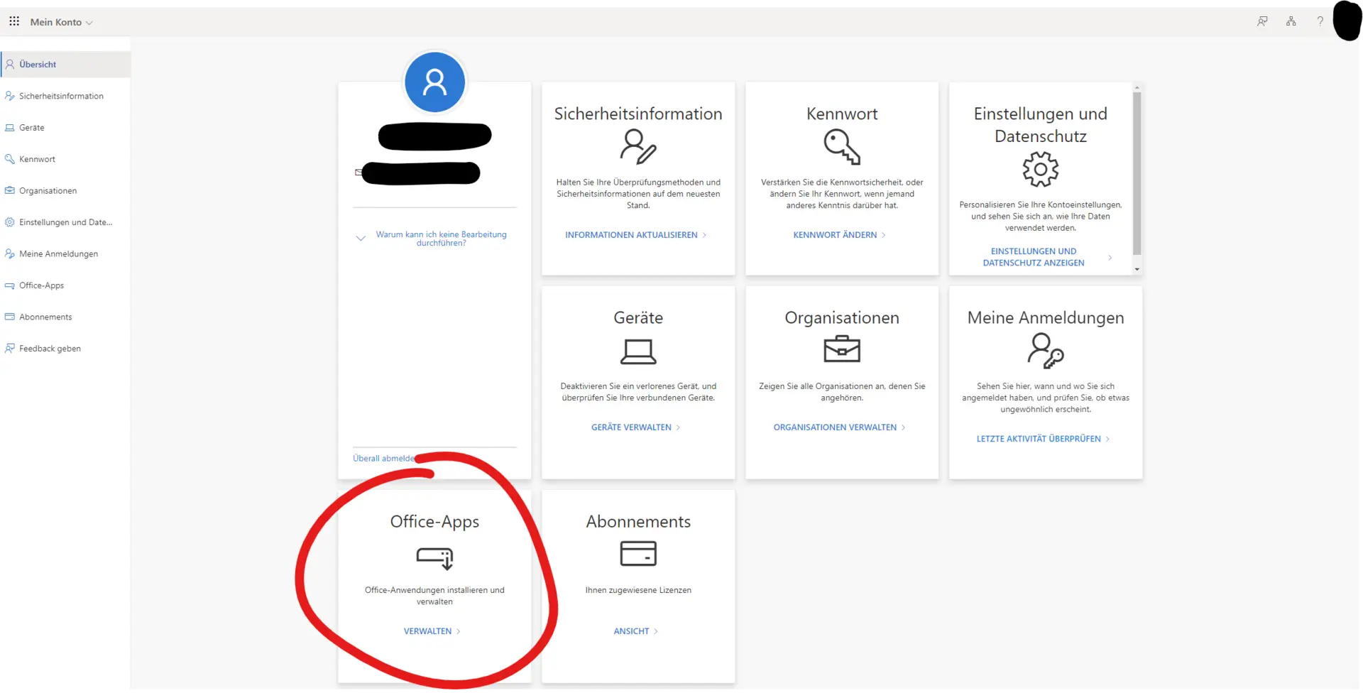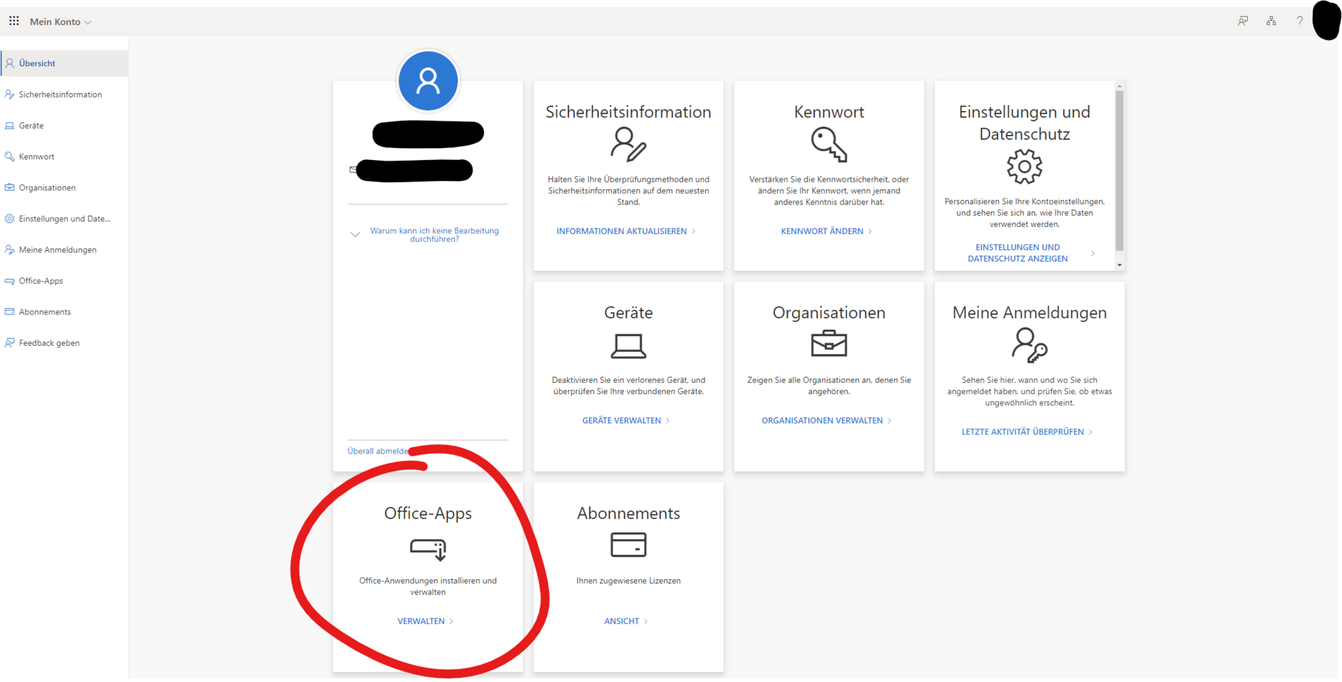 A click on "Manage" opens the page https://myaccount.microsoft.com. Here, information about the business account, security (authentication methods and login history) and data protection can be viewed and partially edited.