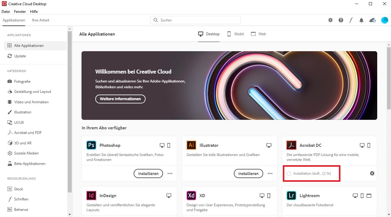 To use the Adobe Creative Cloud applications on the PC, the Adobe Creative Cloud app is required as a central application via which Adobe applications such as Acrobat Professional or Photoshop are installed and also updated. For all devices centrally administered by the University Computer and Media Centre (URMZ), the Adobe Creative Cloud App will be distributed automatically from 08.06.2020.