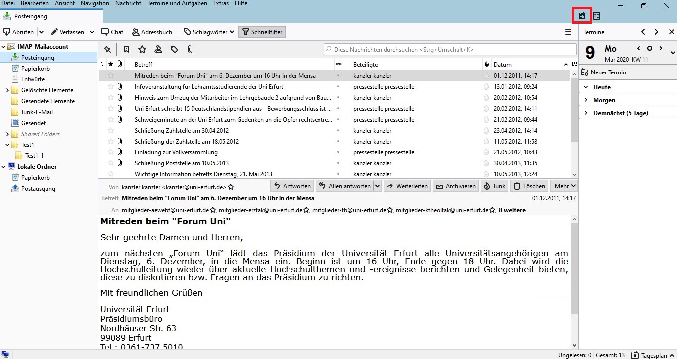 Now you have integrated your university calendar! Under Calendar you will find 2 calendars. You can delete the calendar marked with Private (right click on "Private" and then on "Delete calendar" - confirm with "OK").