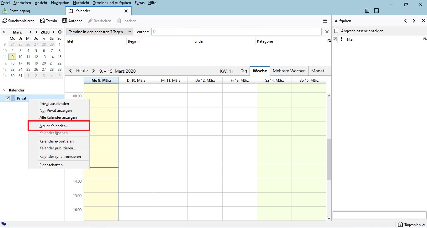 - In the calendar tab, right-click on "Private" in the left pane and click on "New Calendar" in the context menu that appears (Figure 2).