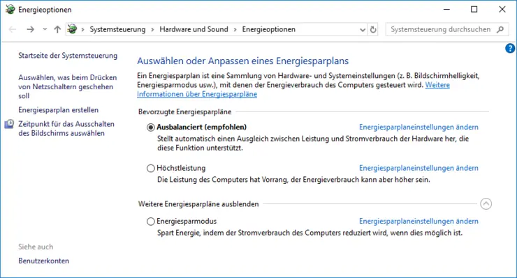Energiesparpläne fassen unterschiedliche Einstellungen zusammen, die sich auf den Energieverbrauch auswirken. Der voreingestellte Plan ist "Ausbalanciert" und sollte in 90% der Fälle vollkommen ausreichend sein (Bild). Unter bestimmten Bedingungen kann es nötig sein, den Energiesparplan "Höchstleistung" auszuwählen bspw. wenn spezielle Verbindungen im Hintergrund zu Datenbankservern aktiv bleiben müssen oder angeschlossene Geräte nicht in einen Stromsparmodus fallen dürfen. Die Energiesparplaneinstellungen erreicht man bspw. über den Link "Zusätzliche Energieeinstellungen" in den Windows-Einstellungen unter "System" -> "Netzbetrieb und Energiesparen".