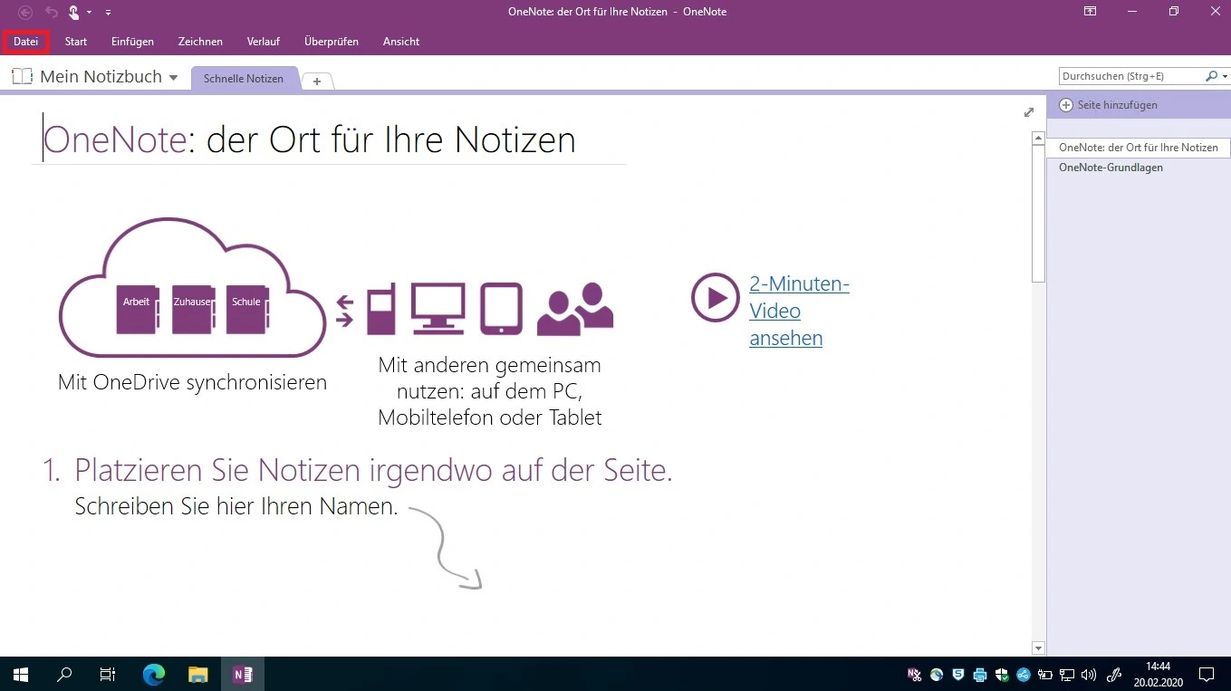 Beim ersten Start öffnet sich Ihr neues Notizbuch, was sich lokal auf Ihrem Gerät im Pfad "C:\Benutzer\[Benutzername]\Dokumente\OneNote-Notizbücher\" befindet.