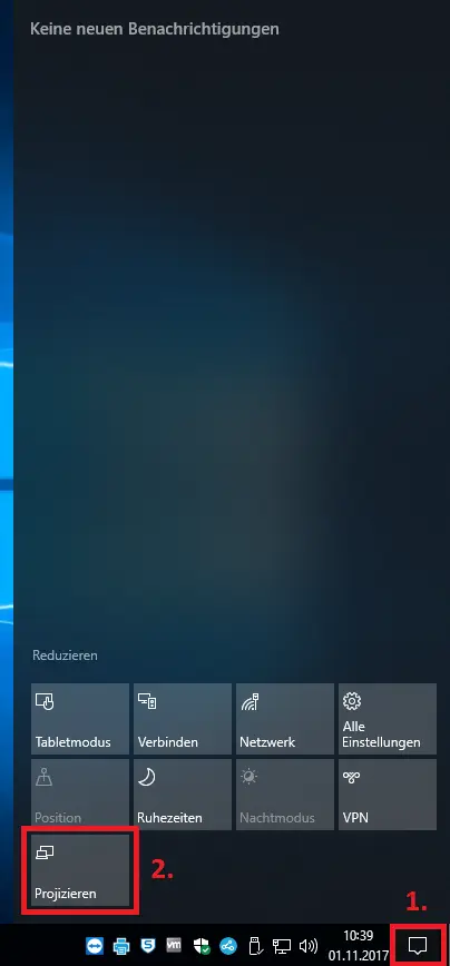 • Über das Info-Center und einen Klick auf "Projizieren" (ggf. vorher Menü "Erweitern")