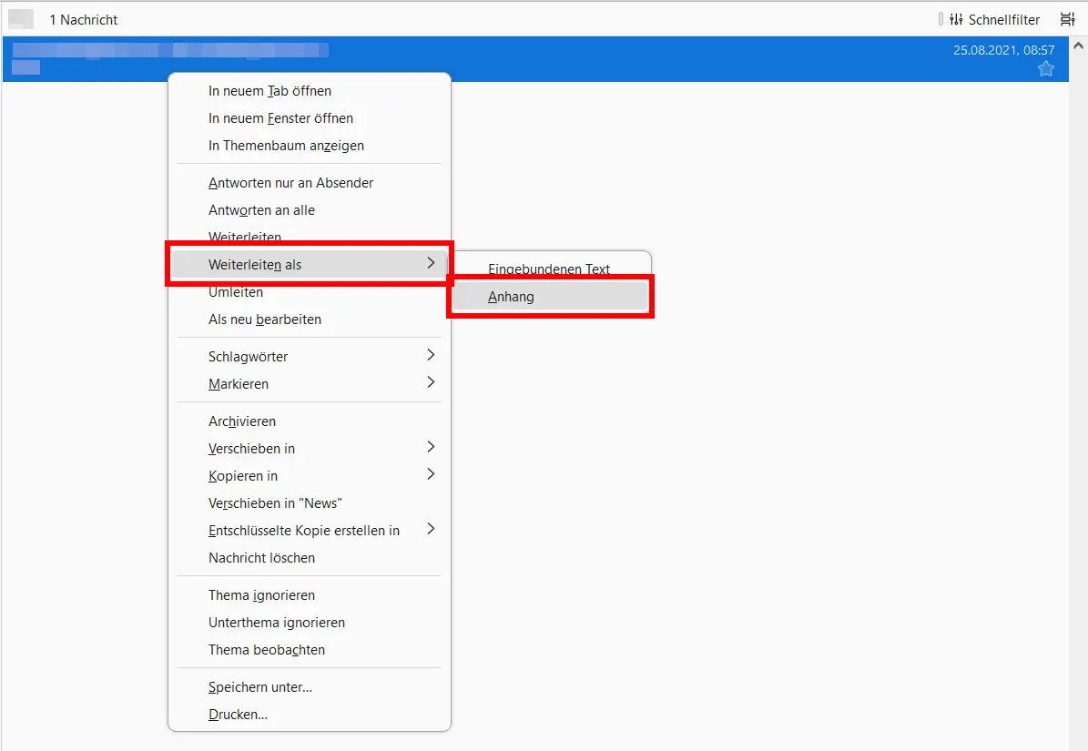 Machen Sie einen Rechtsklick auf die gewünschte E-Mail und klicken Sie anschließend auf "Weiterleiten als" und auf "Anhang" (s. Bild 4)
