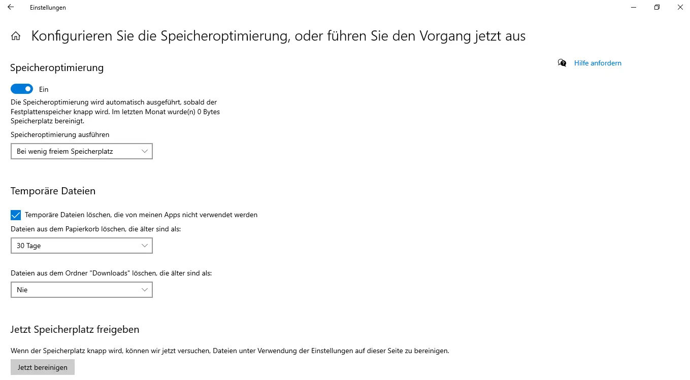 Zudem lässt sich unter "Einstellungen" -> "System" -> "Speicher"die Option "Speicheroptimierung" aktivieren (Bild 1), welche je nach Einstellung unter "Konfigurieren Sie die Speicheroptimierung, oder führen Sie den Vorgang jetzt aus" automatisch nicht verwendete Daten regelmäßig löscht (Bild 2).