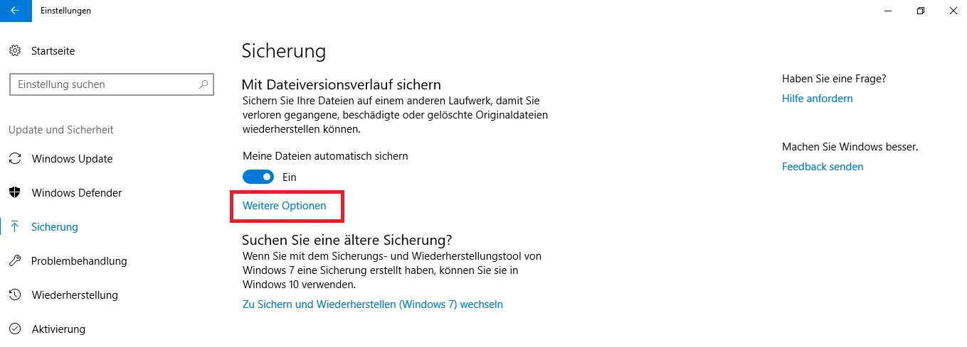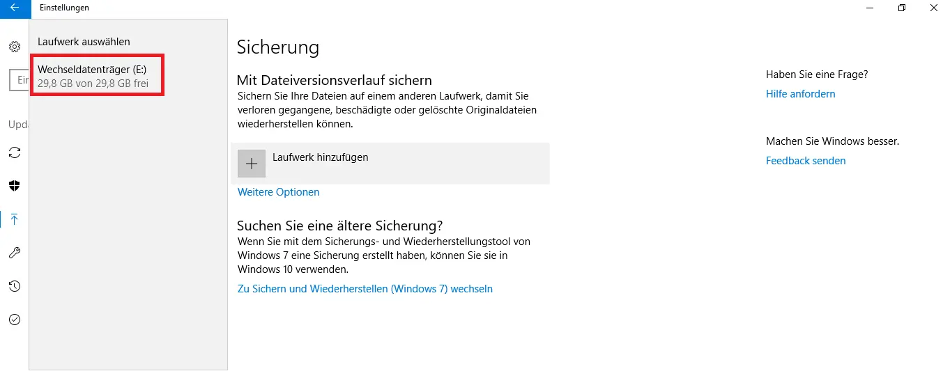 Zur Einrichtung einer Sicherung über den Dateiversionsverlauf gehen Sie wie folgt vor: