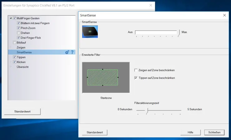 Das SmartSense ist eine Funktion, welche das versehentliche Berühren des TouchPads erkennen und ignorieren soll. Um es zu aktivieren, führen Sie folgende Schritte aus: