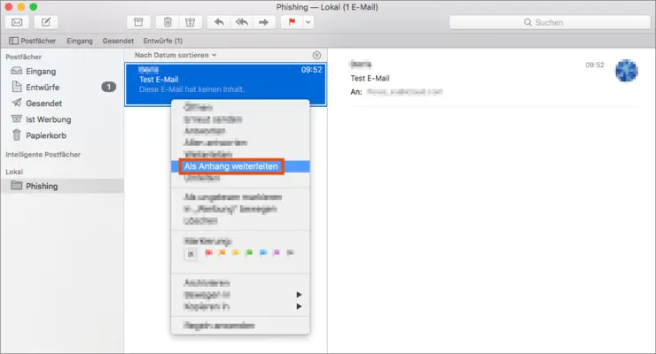 Wenn Sie eine E-Mail ausgewält haben, klicken Sie mit einem Rechtsklick auf diese und wählen Sie anschließend "Als Anhang weiterleiten" aus (s. Bild 5).