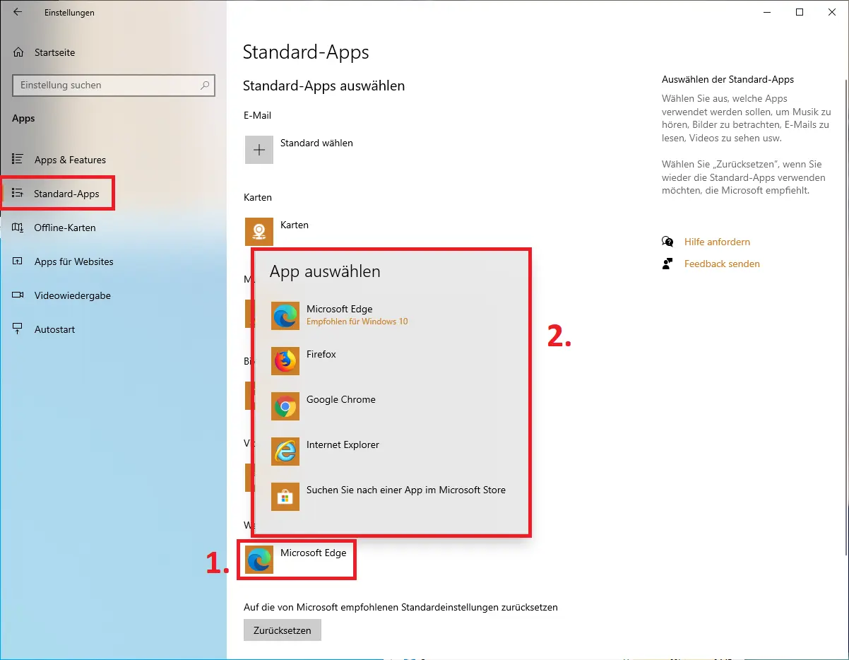 3. Eine Übersicht über einige wichtige Anwendungen gibt Windows direkt auf dieser Seite wie bspw. E-Mail oder Webbrowser. Ein Klick auf "Standard wählen" (wenn noch keine App zugewiesen wurde) oder die jeweils zugewiesene App bietet die Möglichkeit eine entsprechende Standard-App anzugeben (Bild 3).