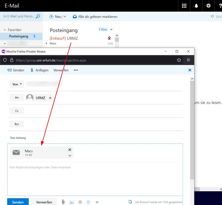 Ziehen Sie die E-Mail, die Sie als Anhang weiterleiten wollen, in eine neue E-Mail via Drag & Drop (s. Bild 2).