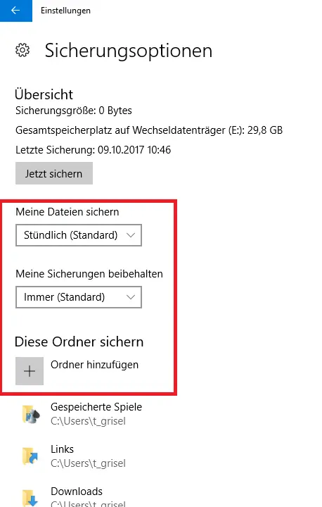 8. Per Standard sind alle persönlichen Verzeichnisse ausgewählt (C:\Users\[Nutzername]). Sollten weitere Verzeichnisse gesichert werden, können diese über "Ordner hinzufügen" ergänzt werden (Bild 6).