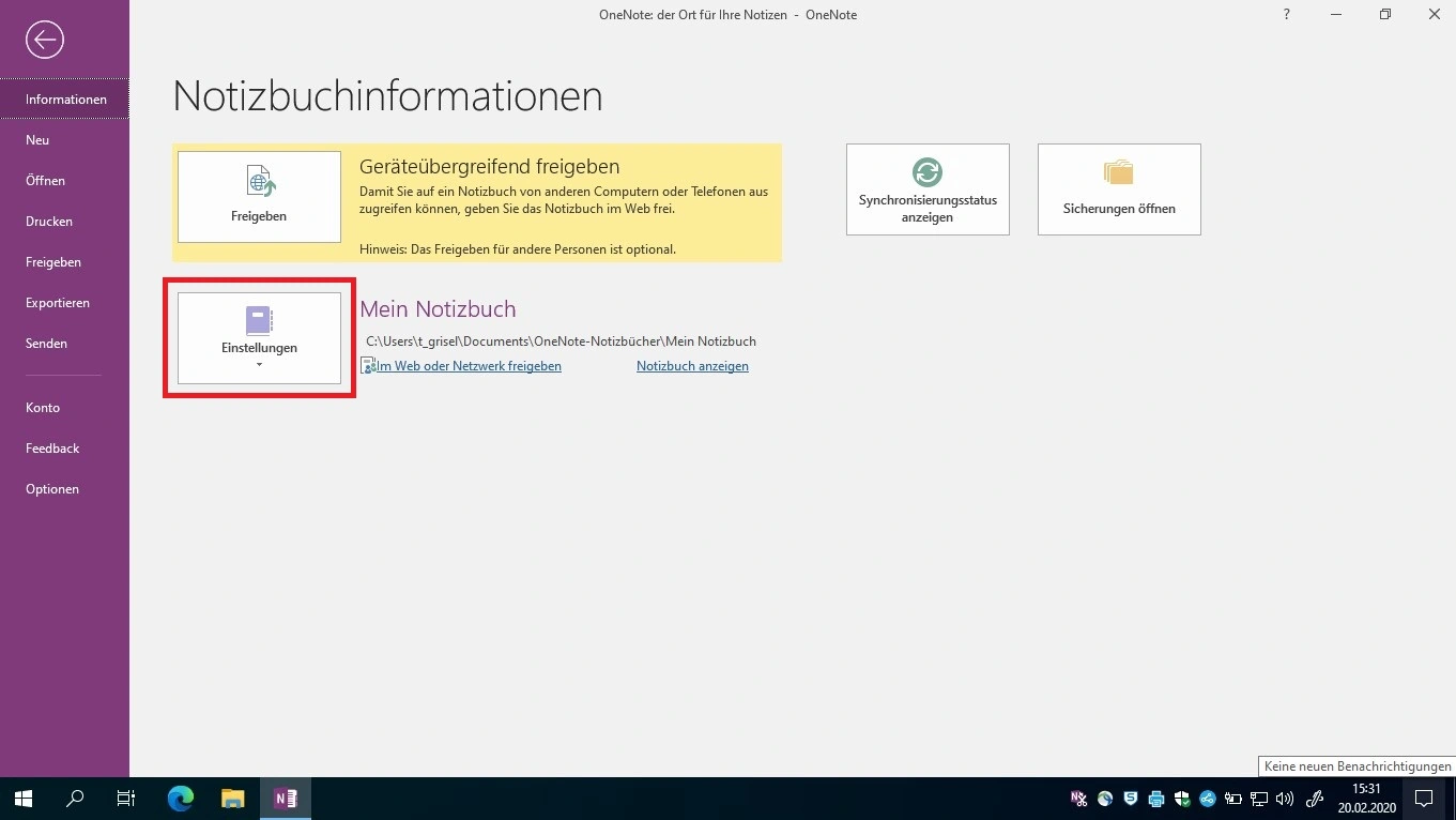 3. auf die "Einstellungen" des Notizbuches klicken (Bild 2)