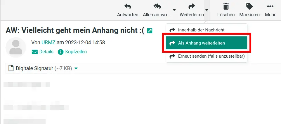 Wenn Sie eine E-Mail ausgewält haben, klicken Sie auf den Pfeil hinter "Weiterleiten" und wählen anschließend "Als Anhang weiterleiten" aus (s. Bild 3).